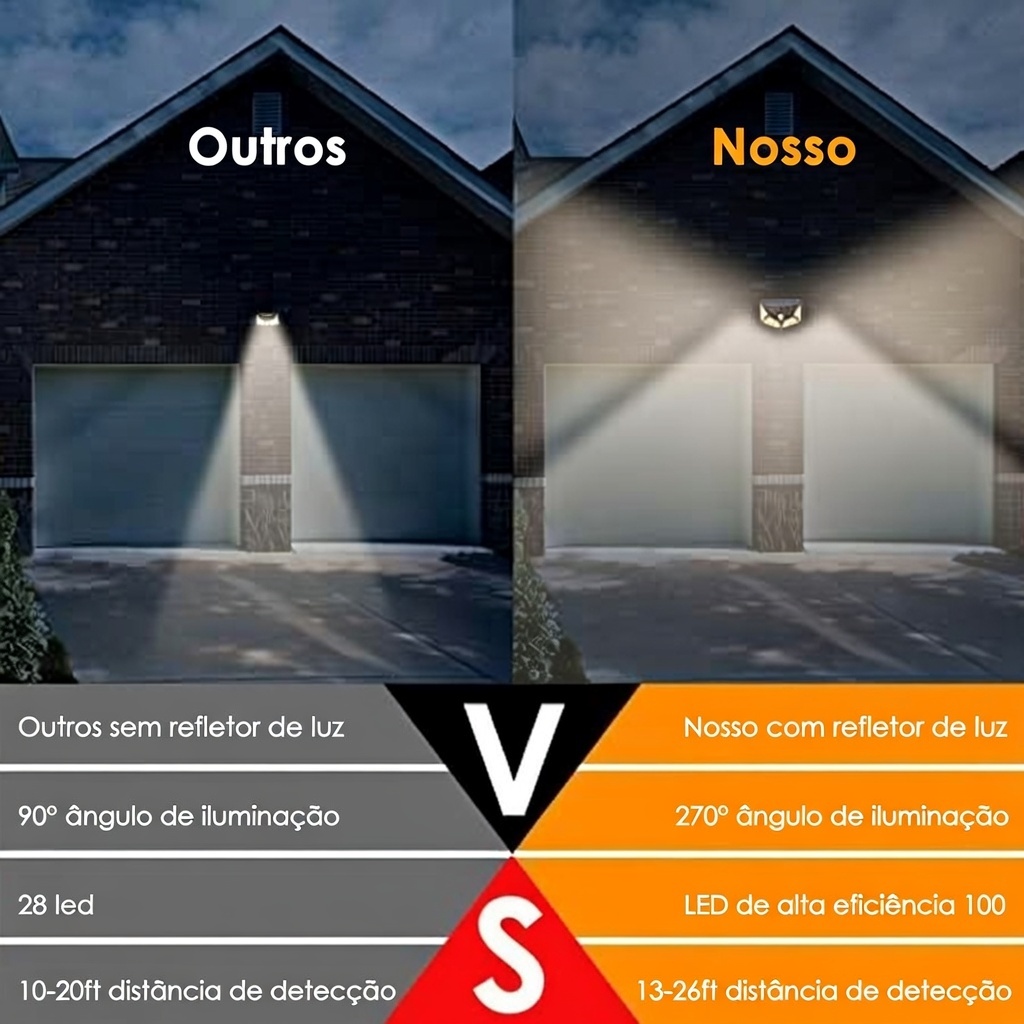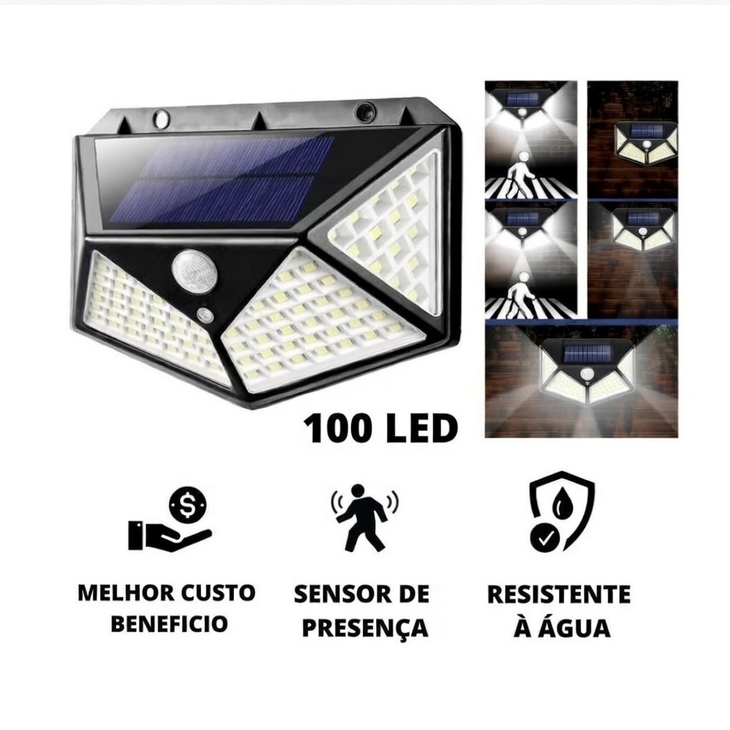 Iluminação potente com 100 LEDs de alta eficiência e ângulo de 270°.